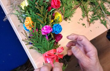 Wspólne przygotowywanie kwiatów z krepiny oraz składanie palm stało się doskonałą okazją do integracji, rozmów i spędzenia czasu w miłej atmosferze. Był to także moment na pielęgnowanie tradycji ludowych oraz powrót do wspomnień związanych z dawnymi obyczajami. Warsztaty sprzyjały również ćwiczeniu sprawności manualnej i rozwijaniu kreatywności uczestników. Efektem spotkań są nie tylko piękne palmy, aleSzczegóły -