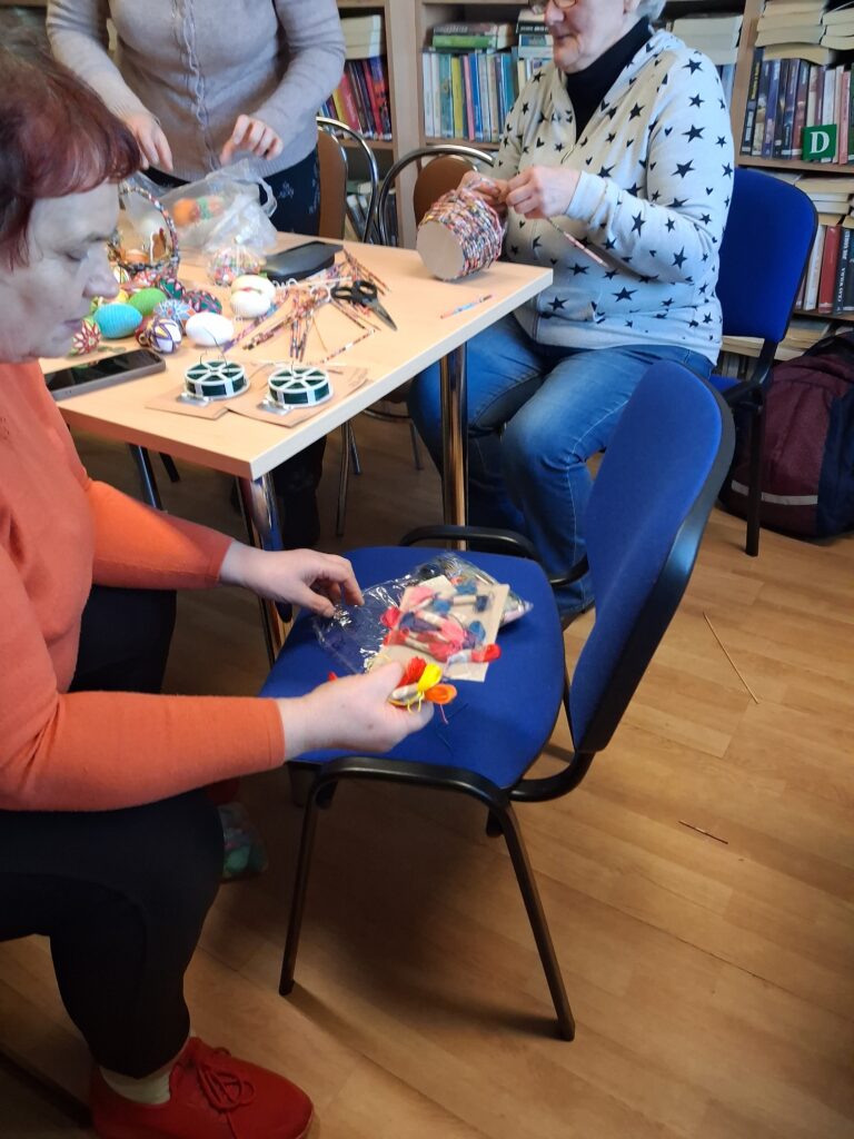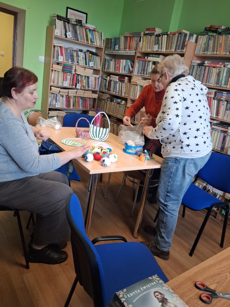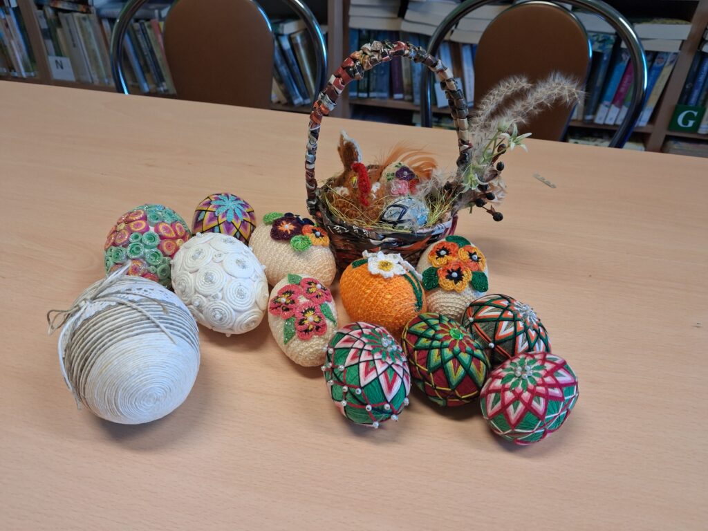 Warsztaty sprzyjały również ćwiczeniu sprawności manualnej i rozwijaniu kreatywności uczestników. Efektem spotkań są nie tylko piękne palmy, ale także urocze, ręcznie wykonane pisanki szydełkowe i metodą temari , koszyki z papierowej wikliny, serwetki. To doskonała okazja by i spędzić czas w radosnej, przedświątecznej atmosferze.