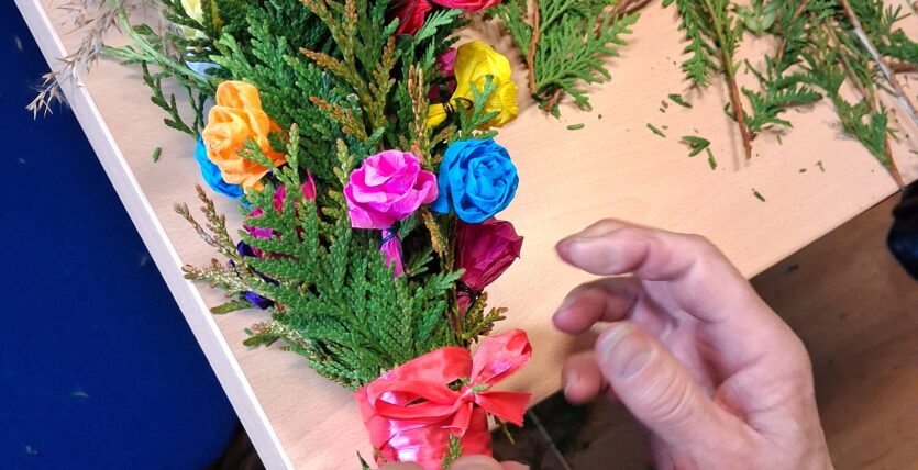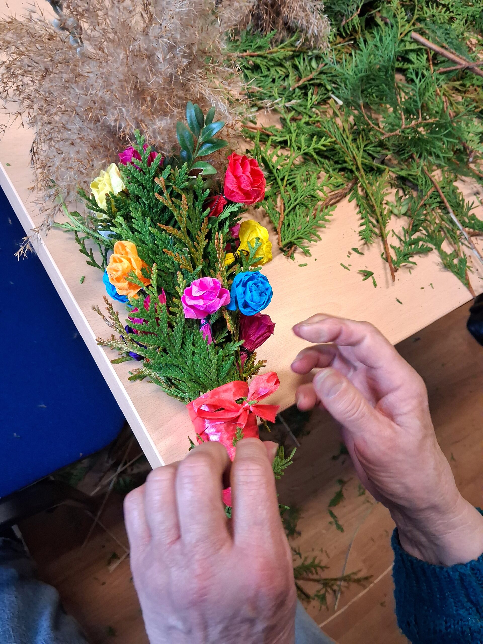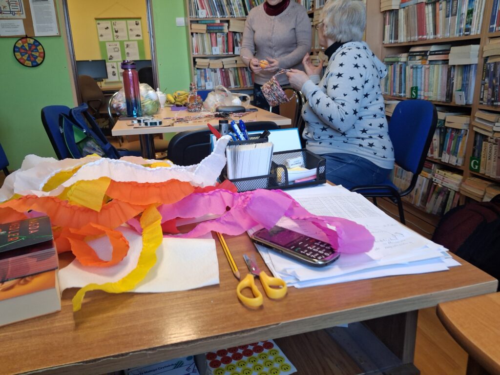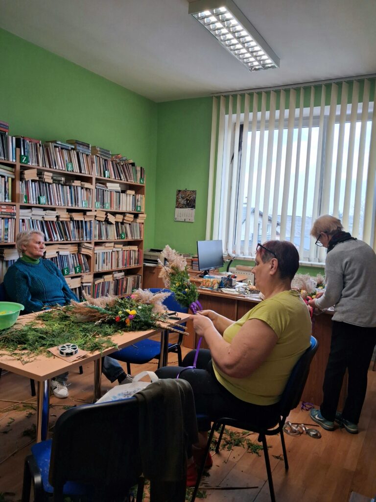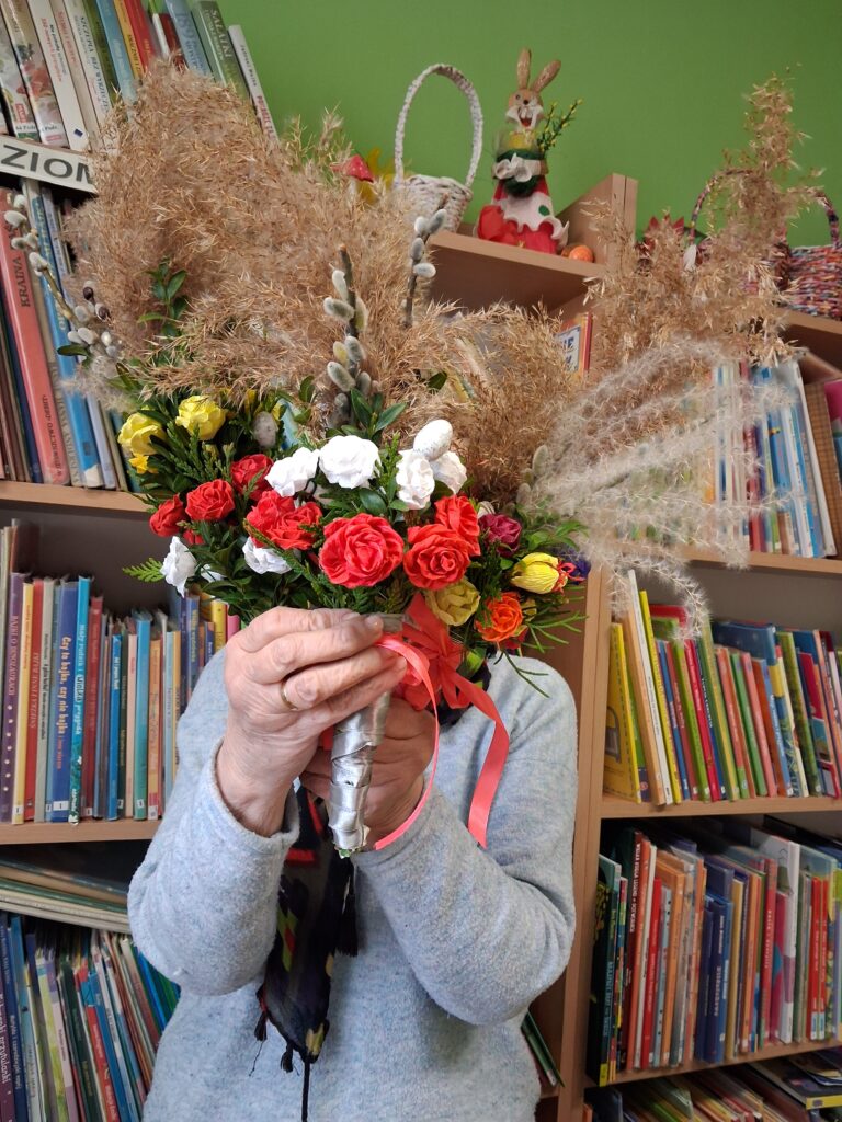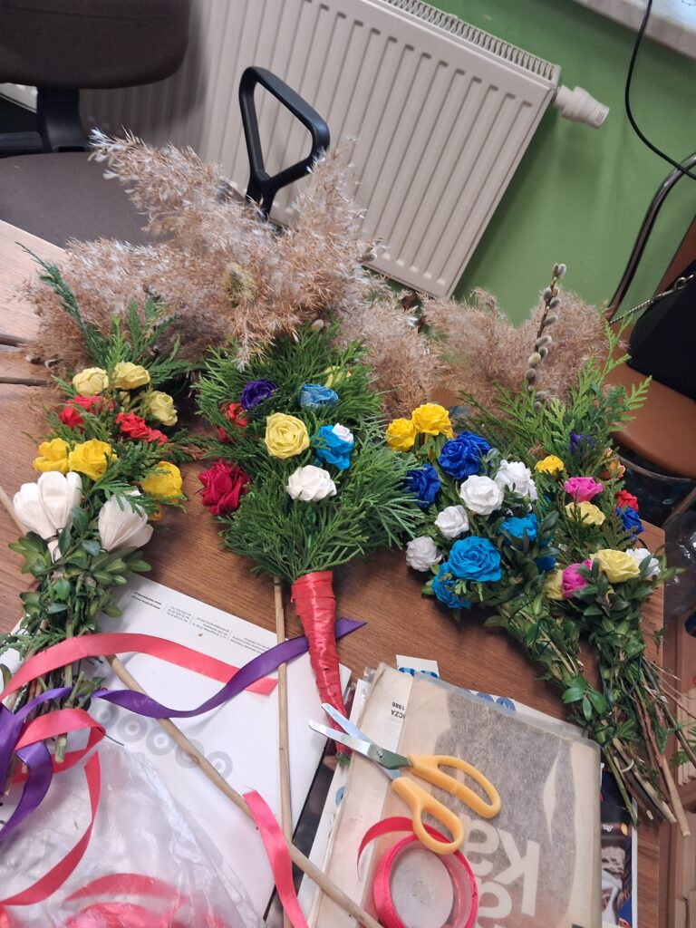 Wspólne przygotowywanie kwiatów z krepiny oraz składanie palm stało się doskonałą okazją do integracji, rozmów i spędzenia czasu w miłej atmosferze. Był to także moment na pielęgnowanie tradycji ludowych oraz powrót do wspomnień związanych z dawnymi obyczajami.