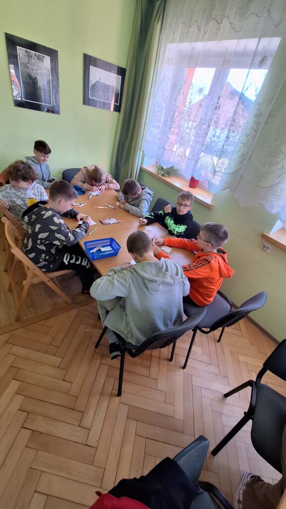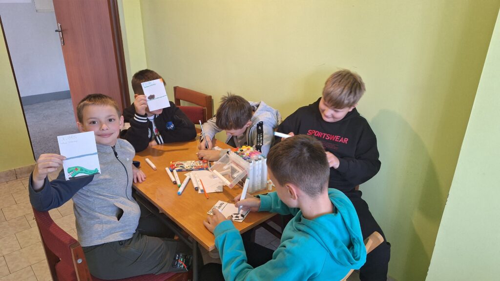 W dalszej części uczniowie obejrzeli prezentację o znaku własnościowym książki czyli ekslibrisie poznając jego historię, funkcje oraz przykłady ekslibrisów z różnych epok. Później przystąpili do tworzenia własnych projektów ekslibrisów, wykorzystując kartki, kredki, flamastry i inne materiały plastyczne. Z dużym zaangażowaniem projektowali swoje znaki, umieszczając na nich imię, nazwisko, motyw graficzny oraz elementy nawiązujące do własnych zainteresowań. Podczas tej pracy wykazali się dużą pomysłowością i kreatywnością.