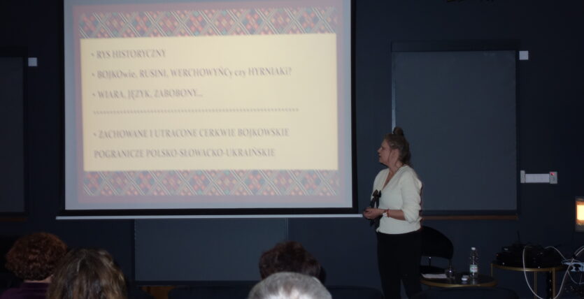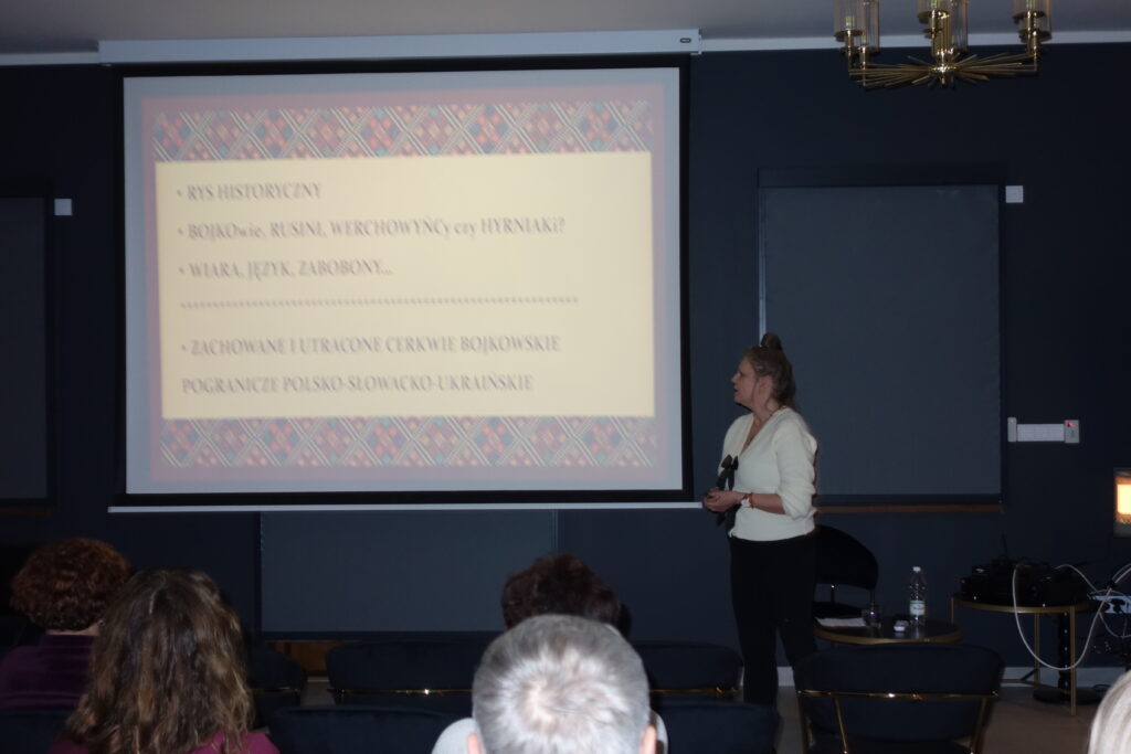 W pierwszej części wykładu, zatytułowanej „Bojkowie – ludność (NIE)zapomniana”, prelegentka przybliżyła uczestnikom historię Bojków, ich pochodzenie, tradycje, codzienne życie oraz bogatą kulturę duchową i materialną. Szczególny nacisk położony został na konsekwencje wysiedleń oraz zanik dawnych bojkowskich wsi, co sprawiło, że pamięć o tej społeczności przez lata ulegała stopniowemu wyciszeniu. Pani Karolina Przytulska podkreślała jednak, że mimo trudnych doświadczeń Bojkowie nie zostali całkowicie zapomniani, a ich dziedzictwo wciąż jest obecne w krajobrazie kulturowym regionu.